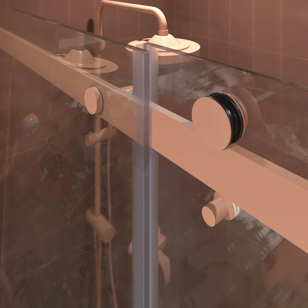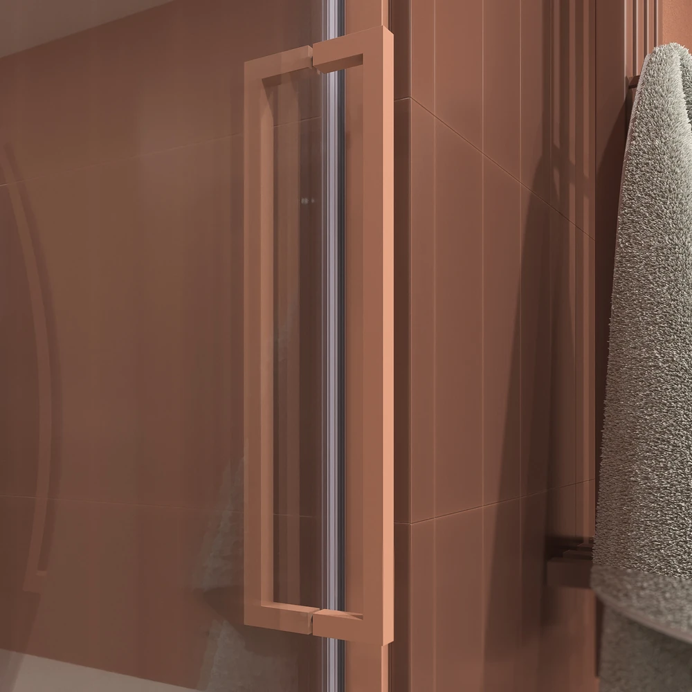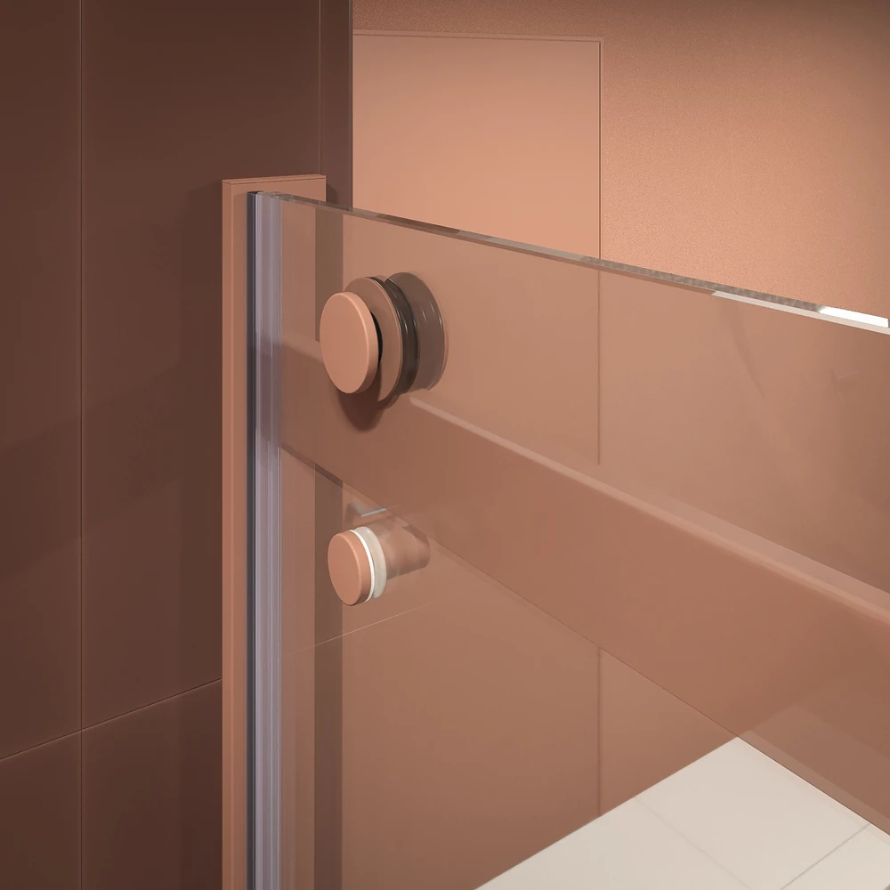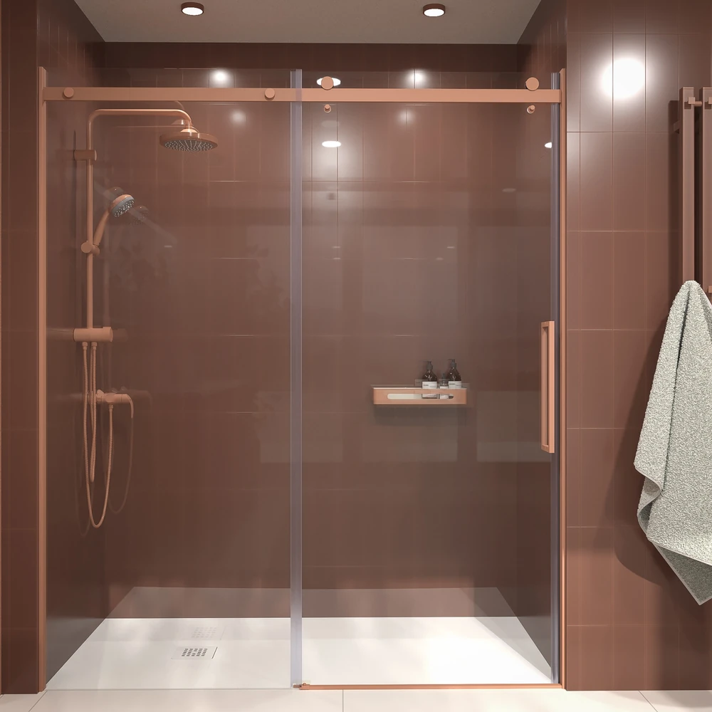 Mampara de ducha NOVUM frontal 1 fijo – 1 puerta corredera vidrio parsol bronce 6 mm. COBRE MATE
