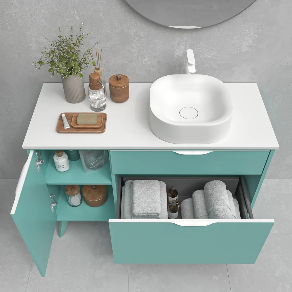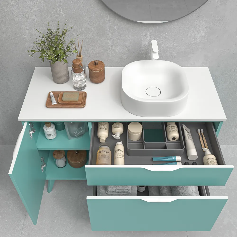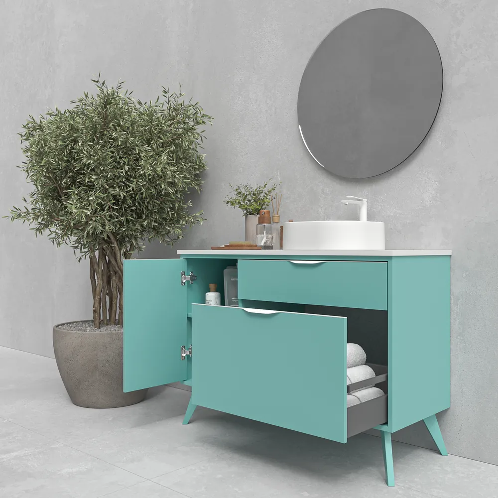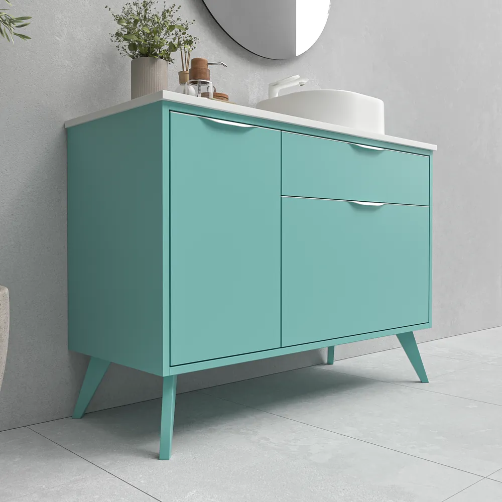 Mueble de baño con patas 2 cajones / 1 puerta KLUM con lavabo Solid Surface VERDE CLARO