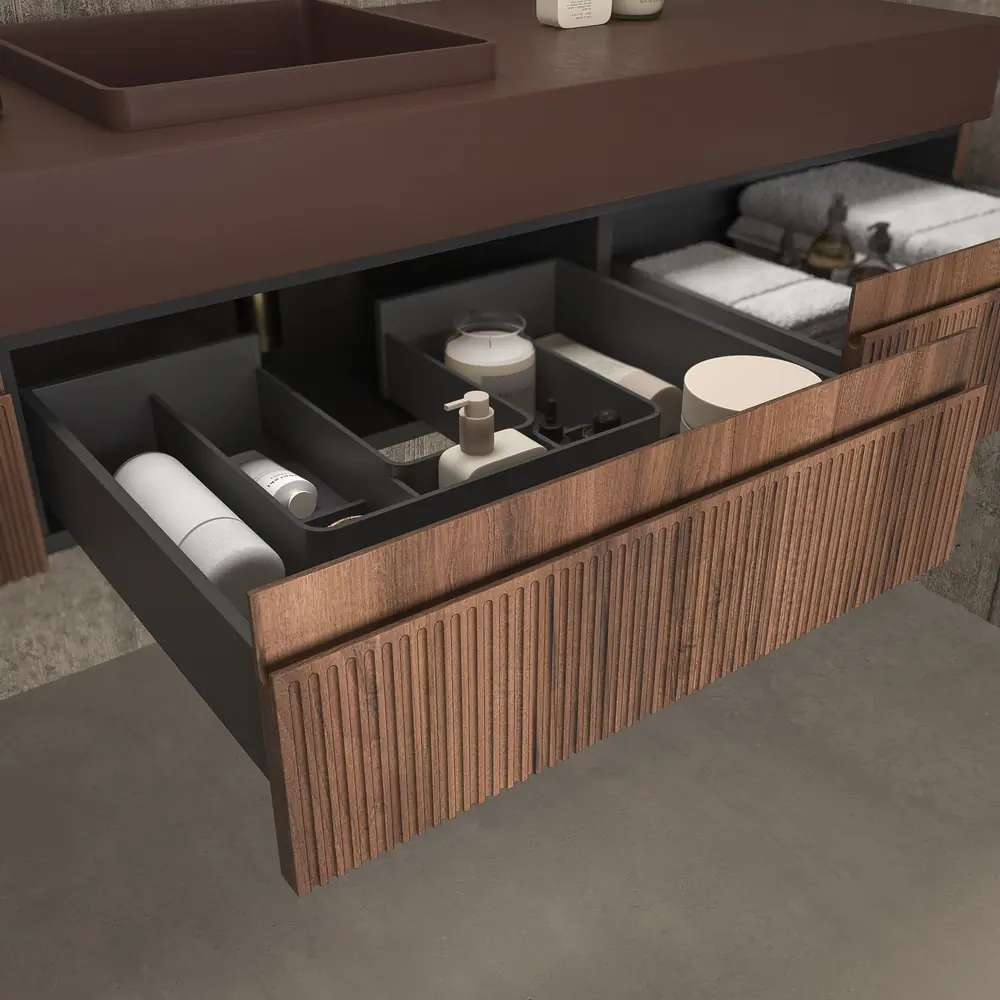 Los muebles de baño suspendido con cajones son ideales para almacenar todos los enseres de baño en orden. Las medida del mueble son de 160 cm / 180 cm / 200 cm /220 cm de ancho x 45 cm de fondo x 50 cm de alto .Esta fabricado en MDF alta presión , un material muy resistente y duradero para que el mueble tenga una larga vida. .Está compuesto por 3 cajones fabricado con guías metálicas de extracción total con cierre amortiguado. La apertura y cierre de los cajones se realiza con uñero integrado . Para completar el mueble de baño de diseño, el lavabo de SOLID SURFACE se puede acabar en la mismo color del mueble y puedes añadir espejos enmarcados en aluminio exactamente igual al color del mueble. Combina con todos los tipos de espejos de nuestro catalogo. El mueble lo podrás escoger en varios acabados diferentes . Para que no pierdas tiempo en montarlo, el mueble te llegará a casa completamente ensamblado. Solamente tendrás que recibirlo e instalarlo a pared de manera sencilla. Un mueble con diseño internacional para tu cuarto de baño.
